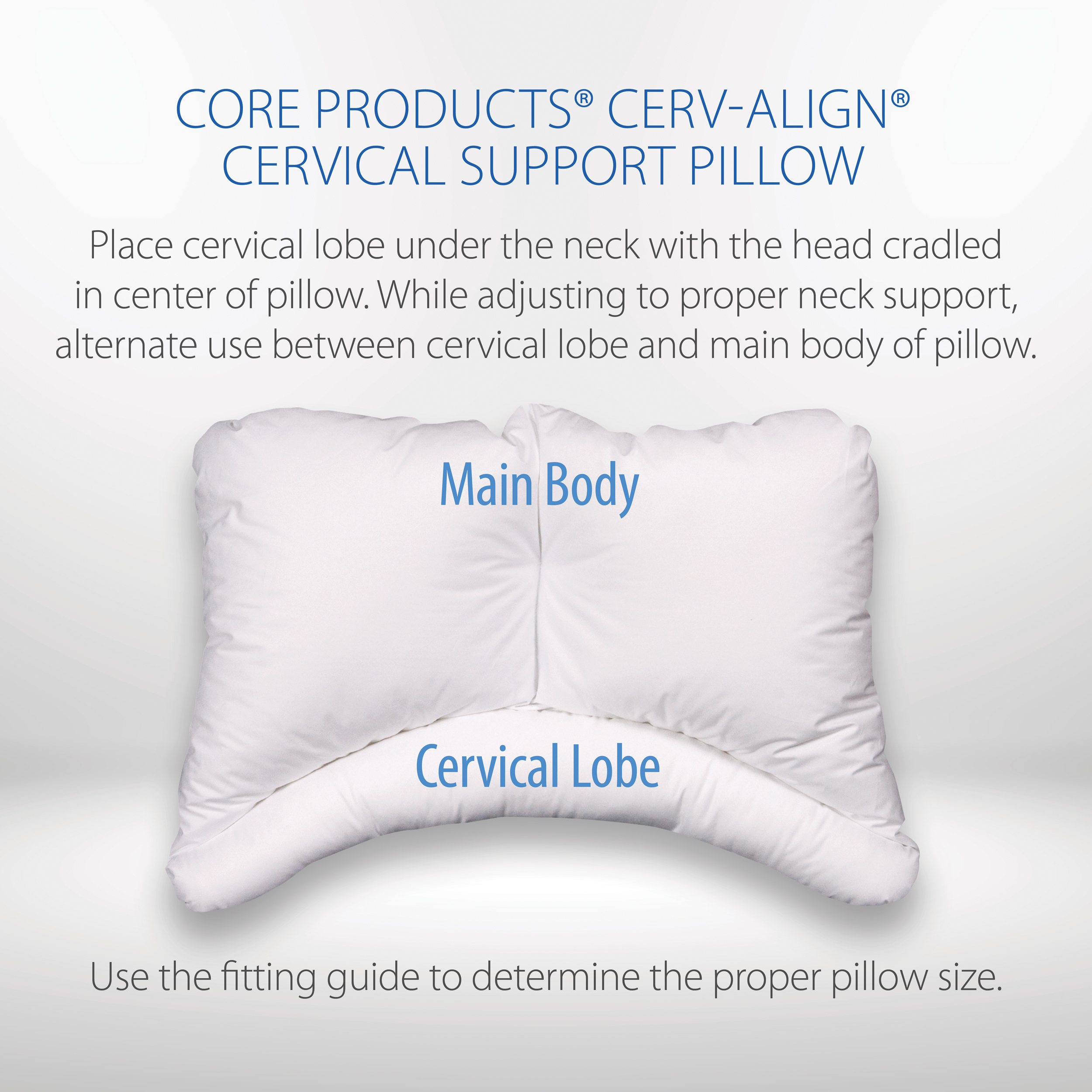 Choose from three distinct lobe sizes for a personalized fit. Covered in high-quality cotton fabric for maximum comfort and durability, the Cerv-Align's exclusive fitting system ensures suitability for any body type, fitting seamlessly into a standard pillowcase.